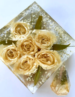 We use silica gel as a method for drying our client’s flowers, as it helps to maintain their original shape and color. However, it is important to note that not all flowers dry well and some colors may change during the drying process. For instance, red roses may dry to a burgundy color, while white roses may dry to a cream or yellow tone. Blush roses may also lose their pink tone and dry to a yellow color. Additionally, many tropical flowers do not dry well. Tropical flowers such as white anthuriums may dry to a brown color and become extremely thin and fragile. It is also important to note that succulents do not dry well and should not be used in resin pieces as moisture can cause them to rot.