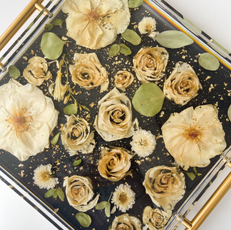 Congratulations to these lovebirds! Thank you to Nico and Santi for letting us preserve your beautiful wedding flowers. We turned their beautiful bridal bouquet into a gold handle tray, bookends, and two candle holders!